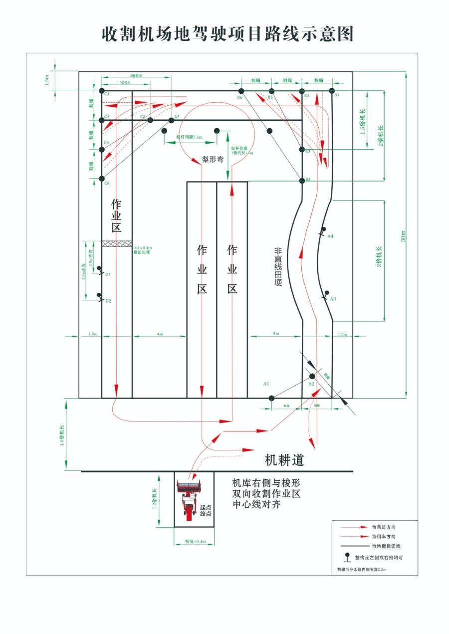 驾驶员由起点出库按图示路线,经机耕道进入模拟田块作业区域。田块作业区域分为内外两圈,外圈为模拟开田边割道,内圈为模拟梭形双向收割道(内圈模拟完成单边收割后,出作业区域按要求绕中心标杆梨形弯调头),作业区域宽幅为收割机分禾器内侧(割刀处)宽度。模拟作业完成后,左转进机耕道,倒车入库至终点位置,停车熄火,完成比赛。