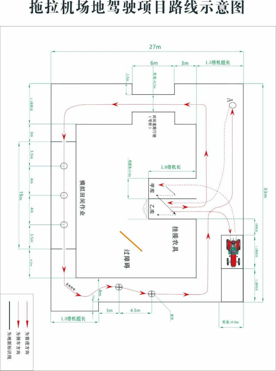 驾驶员按图示路线,由停机库倒车出库,一次倒车入甲库,二进二退移库至乙库,停车熄火,下车完成挂接农具(悬挂犁,犁铧拆去,改装套钩),挂接好农具后提升至“运输”状态,按图示路线左转出库。进行田间道路模拟驾驶,通过窄桥、进入作业区域地头,模拟耕地作业(钩取挂圈)。完成作业后,出作业区,过急弯(直角转弯),驶入连续障碍路,通过障碍后,行驶至指定地点 A 停车。倒车入乙库,拆卸农具,完成后右转出库驶回停车库(初始位置)。