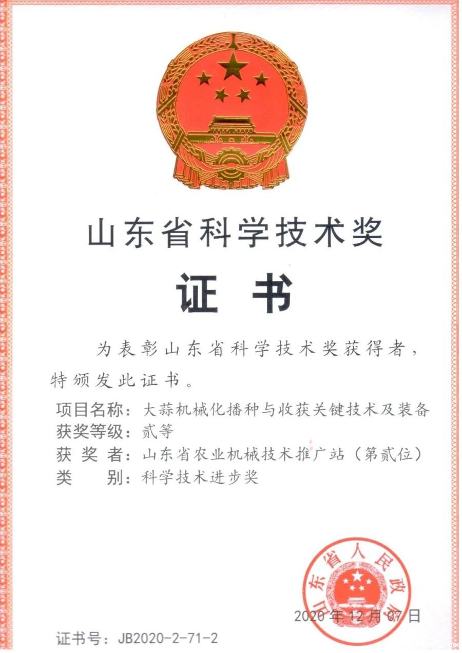 通过卓有成效的工作,近年来,山东省特色蔬菜机械化程度显著提高,保障了国内蔬菜市场有效供给,也为全省特色农产品产业长远健康发展提供了新动能。有关工作成果受到各级各部门表彰肯定,参与的“大蒜机械化播种与收获关键技术及装备”获得2020年山东省科学技术进步二等奖。与农业农村部农机化总站共同申报的“大葱机械化生产关键技术装备”被中国农学会评为2020中国农业农村10项重大新装备之一,并入选中国科协“科创中国”技术服务和科创平台。总结提炼的山东大蒜、山东章丘、莱芜生姜等入选全国蔬菜适宜品种全程机械化生产模式与典型案例。制定的“大蒜机械化种收技术”连续4年被列为山东省农业主推技术。主持完成的“大蒜生产关键环节机械化技术集成与示范推广”成果,经第三方评价,整体技术水平达到国内领先,其中大蒜正芽播种技术居国际领先。