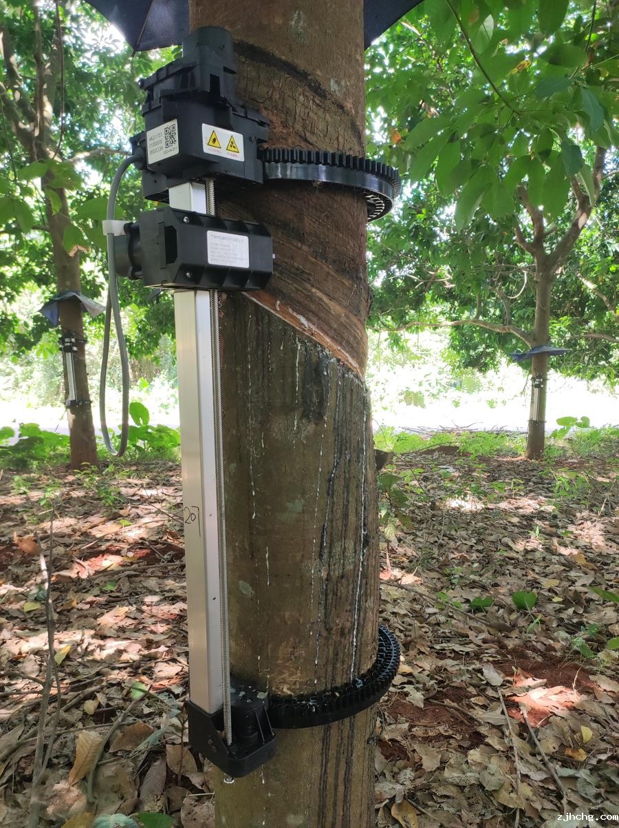中国橡胶种植面积约为1728万亩,产量81万吨,其中海南770万亩,产量约35万吨。橡胶胶价已持续低迷多年,人工割胶平均每亩毛收益800-1000元,扣除管理费、肥料、农药、人工成本后,胶园收益低。割胶技术要求高、割胶机械工况环境复杂,导致机械化割胶一直是世界性难题。割胶工作在凌晨两、三点进行,高温、高湿环境恶劣,职业病高发,以及蚊虫蛇鼠猖獗,导致越来越多的割胶工离开胶园,年轻人更不愿意从事割胶工作,造成胶园弃管弃割或改种现象日益严重。因此,推广应用智能化、自动化割胶机是橡胶产业发展的必然趋势和首要任务。