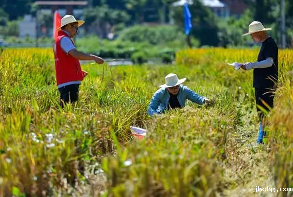 评判专家检验参赛选手收割水稻的情况。付作侨摄