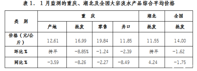 1、1月监测的全国、湖北批发及重庆各类型大宗淡水产品综合均价环比、同比稳中有跌,以跌为主(见表1)。