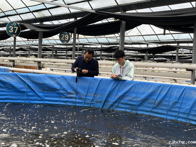 林教授一行4人对重庆牧堂纯农业综合开发有限公司陆基圆池循环水养殖生产情况、水质调节、水体循环、尾水处理等情况进行实地察看和调查。按照常规养殖水体和新换循环养殖水体进行分组,组内设置3个对照,现场测定pH、溶氧,固定水样后在实验室进行氨氮、总磷、COD等指标的定量分析,另外还对养殖尾水各项指标进行检测,用于评估尾水处理效果。在铜梁区牧农农业专业合作社,林教授一行对陆基圆池循环水苗种培育、循环水设施、饲料驯化、尾水治理等情况进行了详细调研,推荐养殖业主进行多品种名特优苗种培育,降低市场风险。林教授一行还对加州鲈疾病防控进行了指导,对校企融合、科技示范合作进行协商。