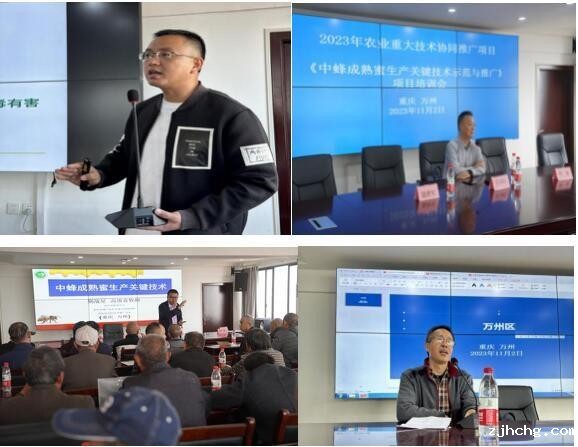 本次培训会邀请了四川省畜牧总站高级畜牧师赖康,重庆市畜牧技术推广总站研究员景开旺,高级畜牧师荆战星,万州区畜牧发展中心高级畜牧师陈光国分别做了《蜂蜜高质量生产技术》《养蜂中的注意事项》《中蜂成熟蜜生产关键技术》《蜂业常用法律法规》4个专题报告。