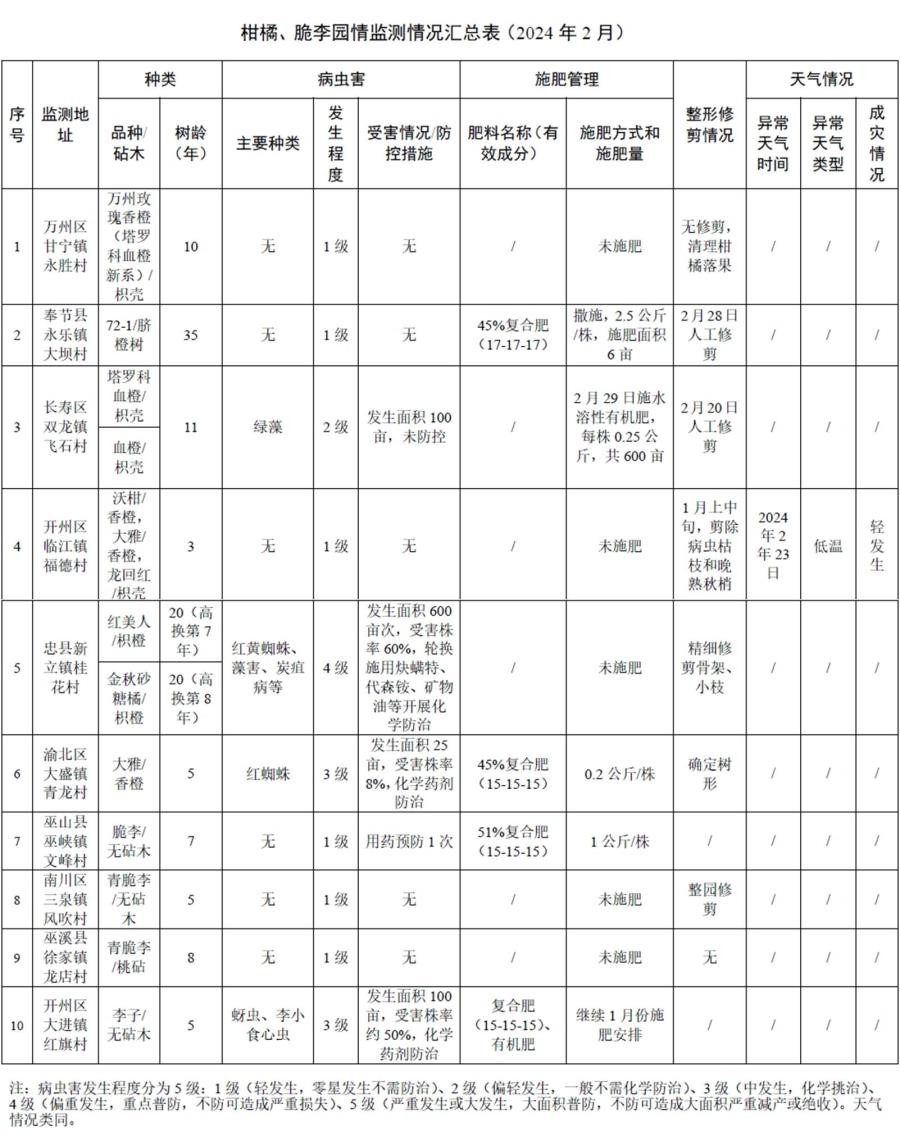 为推动全市柑橘、脆李产业高质量发展,精准监测果树病虫害、异常天气、开展农事操作等情况,科学研判形势、指导生产,现对奉节、万州、开州等区县的园情监测点情况发布如下: