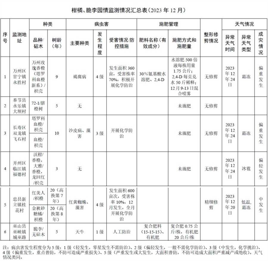 为推动全市柑橘、脆李产业高质量发展,精准监测果树病虫害、异常天气、开展农事操作等情况,科学研判形势、指导生产,现对奉节、万州、开州等区县的园情监测点情况发布如下: