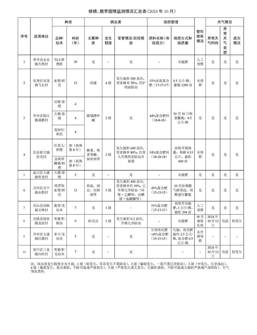 为推动全市柑橘、脆李产业高质量发展,精准监测果树病虫害、异常天气、开展农事操作等情况,科学研判形势、指导生产,现对奉节、开州等区县的园情监测点情况发布如下: