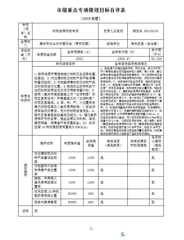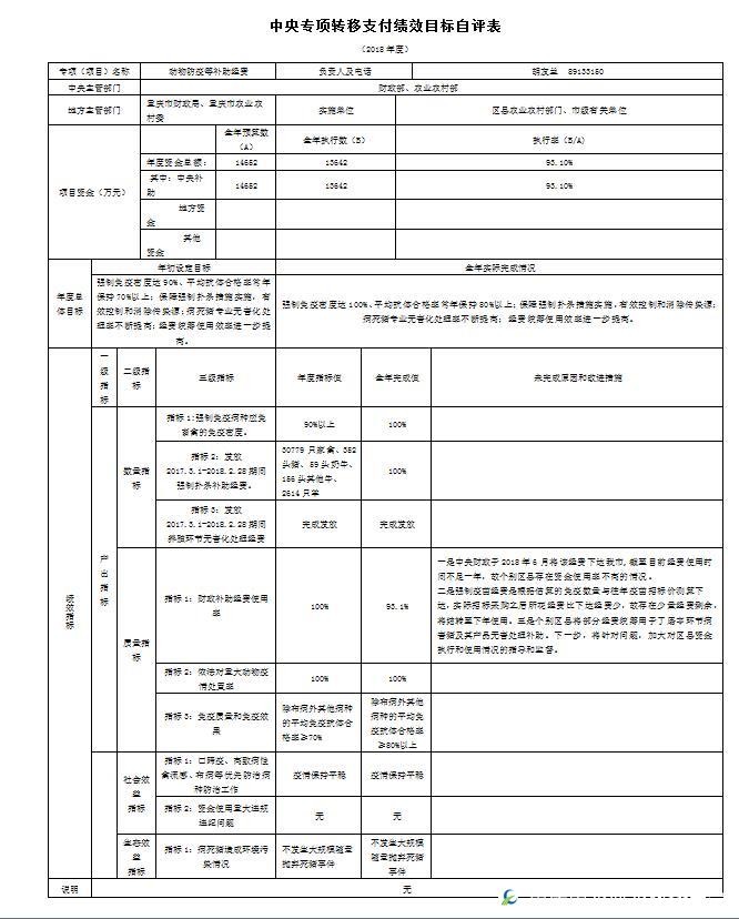 按照市财政局《关于开展2018年度预算资金绩效目标自评工作的通知》(渝财绩〔2019〕5号)要求,现将重庆市动物防疫等补助经费的绩效评价报告向社会公开,报表如下,相应报告附后。