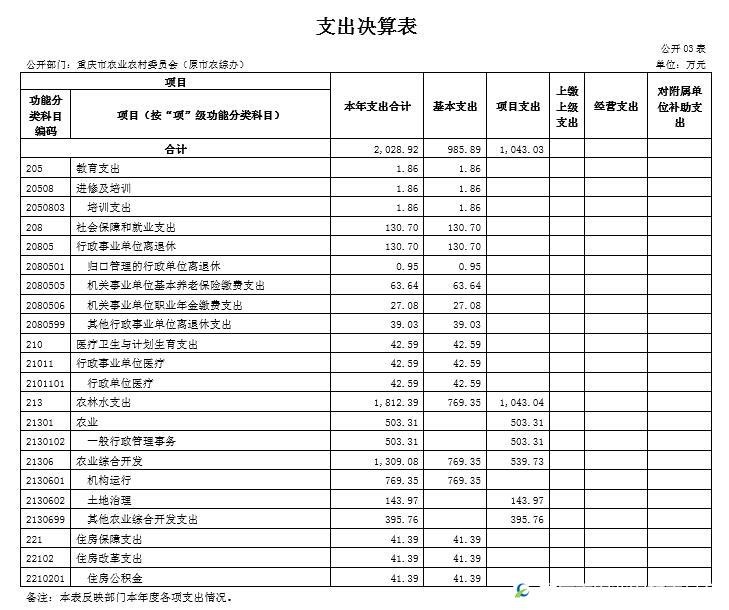 2.支出情况。本部门2018年度财政拨款支出2,028.63万元,较上年决算数减少199.86万元,下降8.97%。主要原因是预算收入减少。较年初预算数增加565.53万元,增长38.65%。主要原因是上年结转结余395.76万元已全部使用和年中追加农综开发事业费90万元等。