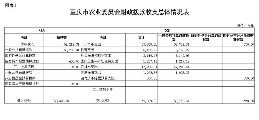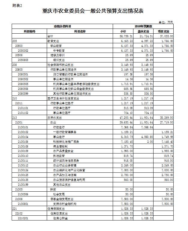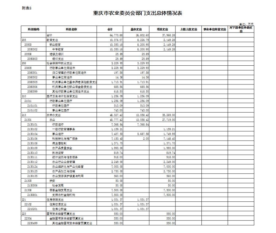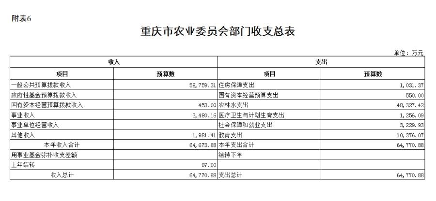 (二)单位构成。我委系统预算机构共有20个,分别是1个行政单位重庆市农业委员会机关;6个参公事业单位:重庆市农村合作经济经营管理站、重庆市种子管理站、重庆市渔政监督管理处、重庆市动物卫生监督所、重庆市农业行政执法总队、重庆市农机安全监理所;9个公益一类事业单位:重庆市农业生态与资源保护站、重庆市农业广播电视学校、重庆市水产技术推广总站、重庆市农业技术推广总站、重庆市畜牧技术推广总站、重庆市农业信息中心、重庆市农产品质量安全中心、重庆市动物疫病预防控制中心、重庆市农业机械化技术推广总站;4个公益二类事业单位:重庆市农业学校、重庆市农业机械鉴定站、重庆市农业机械化学校、重庆市农业委员会干部学校。直属事业单位中有另市农业科学院、市畜牧科学院为市财政一级预算单位,因此本说明不包含市农业科学院、市畜牧科学院收入支出预算安排相关数据。