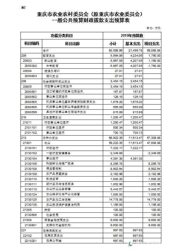 2019年一般公共预算财政拨款收入80,568.66万元,一般公共预算财政拨款支出80,568.66万元,比2018年增加21,809.35万元。其中:基本支出21,499.78万元,比2018年减少224.53万元,主要原因是人员经费减少、公益2类事业单位实行政府购买服务改革以及中职学校招生人数下降,主要用于保障在职人员工资福利及社会保险缴费,离休人员离休费,退休人员补助等,保障部门正常运转的各项商品服务支出;项目支出59,068.88万元,比2018年增加22,033.88万元,主要原因是加大了农业产业化项目支持力度、政务信息化新续建项目增加以及中央补助资金增加,主要用于农业服务体系建设、动物疫病防控、农业资源与生态保护、农业产业发展等重点工作。