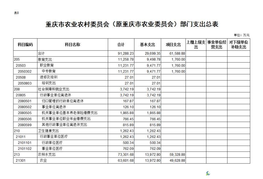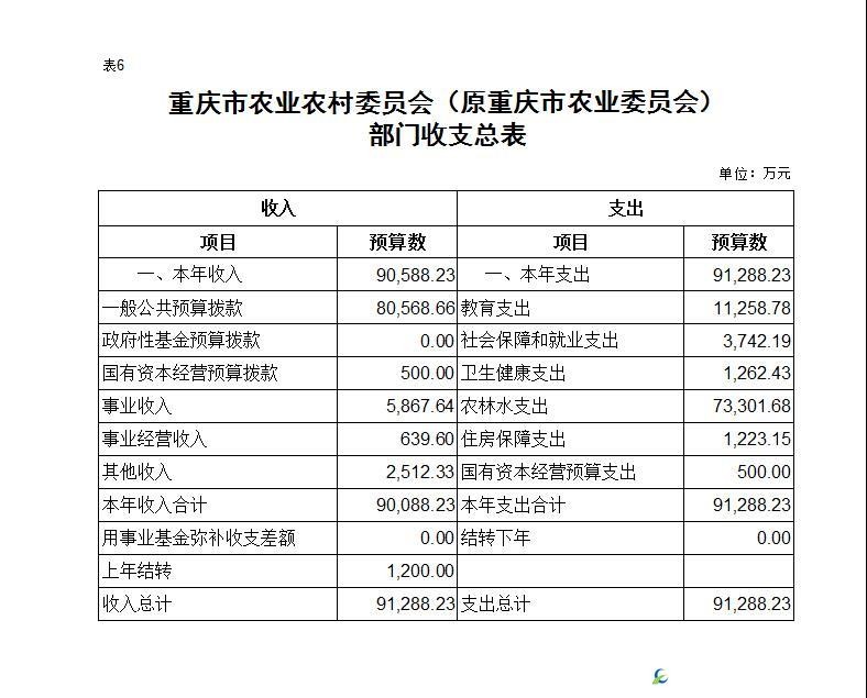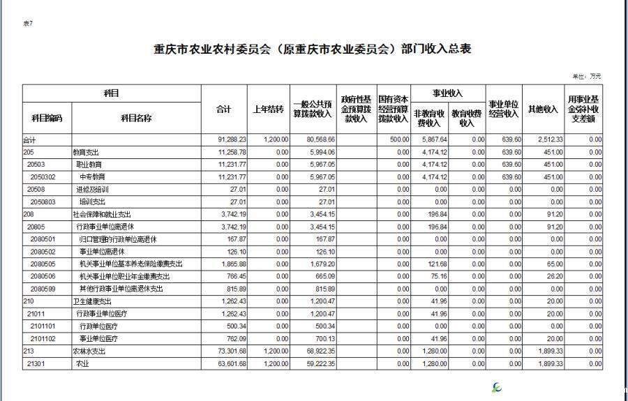 (二)单位构成。原市农委预算机构共有20个,分别是1个行政单位重庆市农业委员会机关;6个参公事业单位:重庆市农村合作经济经营管理站、重庆市种子管理站、重庆市渔政监督管理处、重庆市动物卫生监督所、重庆市农业行政执法总队、重庆市农机安全监理所;9个公益一类事业单位:重庆市农业生态与资源保护站、重庆市农业广播电视学校、重庆市水产技术推广总站、重庆市农业技术推广总站、重庆市畜牧技术推广总站、重庆市农业信息中心、重庆市农产品质量安全中心、重庆市动物疫病预防控制中心、重庆市农业机械化技术推广总站;4个公益二类事业单位:重庆市农业学校、重庆市农业机械鉴定站、重庆市农业机械化学校、重庆市农业委员会干部学校。直属事业单位中有另市农业科学院、市畜牧科学院为市财政一级预算单位,因此本说明不包含市农业科学院、市畜牧科学院收入支出预算安排相关数据。