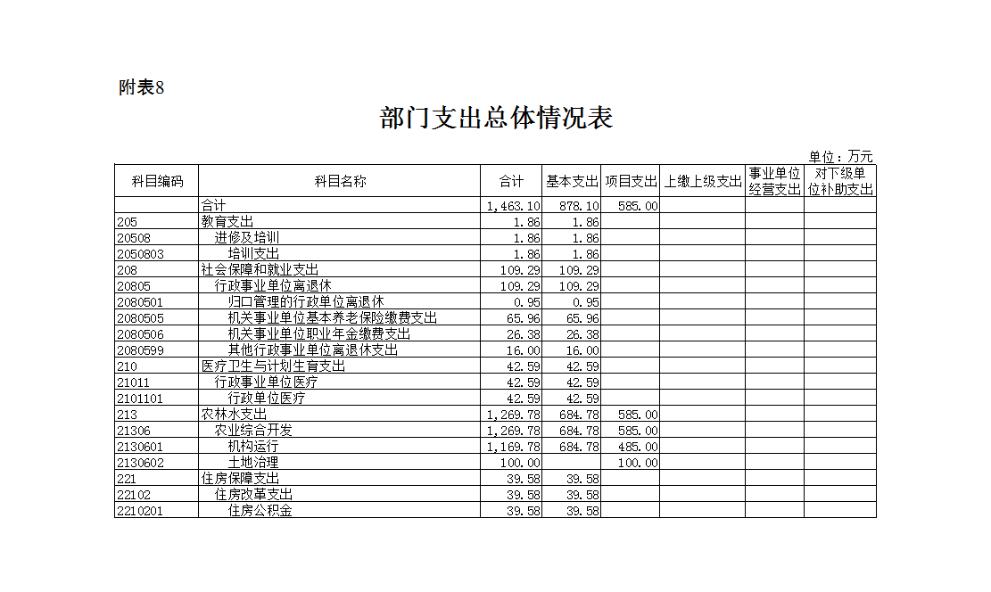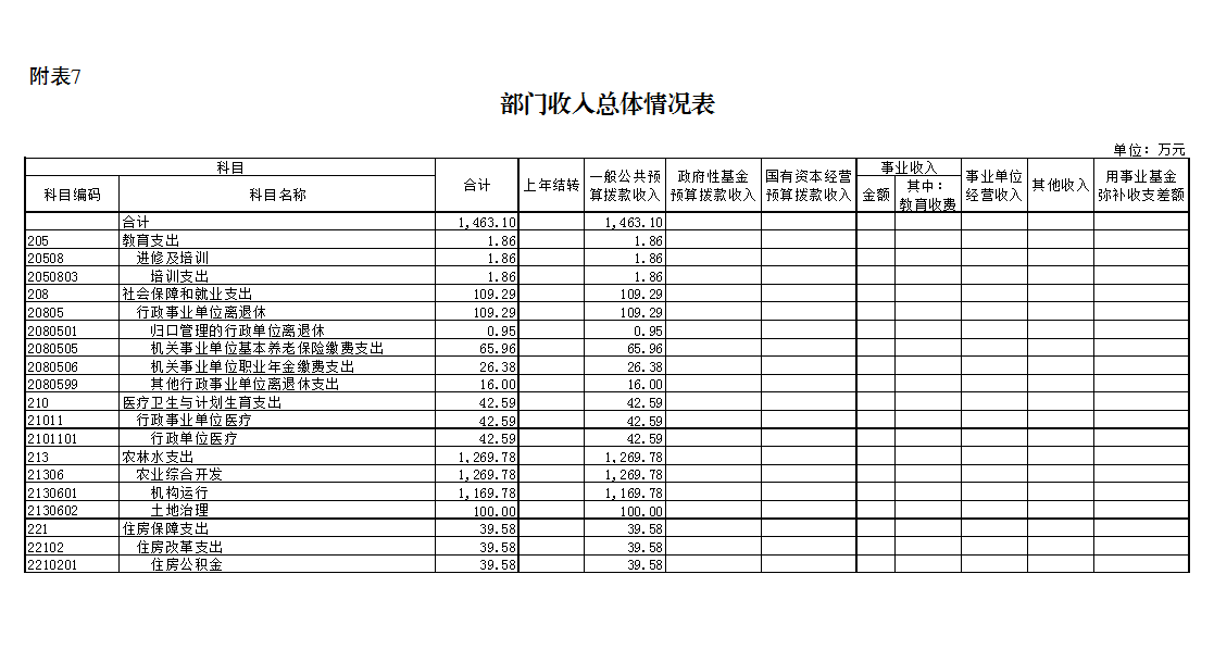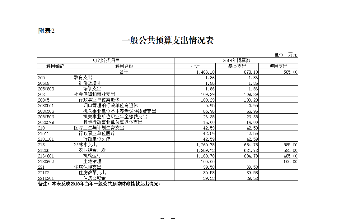 2018年一般公共预算财政拨款收入1463.1万元,一般公共预算财政拨款支出1463.1万元,比2017年减少8035.28万元。其中:基本支出878.1万元,比2017年增加187.72万元,主要原因是增加了军转干部以及提高了公用经费定额支出标准,主要用于保障本单位在职人员工资福利及社会保险缴费,保障部门正常运转的各项商品服务支出;项目支出585万元,比2017年减少8223万元,主要原因是减少了基金项目以及分配到市级部门的农综项目等,主要用于全市农业综合资金计划编制及培训、全市农业综合开发资金决算、资金管理及培训,全市项目管理和监督、国家农发办对我市农业综合开发项目检查验收及与开展农业综合开发事业发展相关的支出,聘请中介机构检查区县资金使用情况,世行项目管理,农业综合开发信息系统建设及课题研究,有关市级部门农业综合开发项目等重点工作。