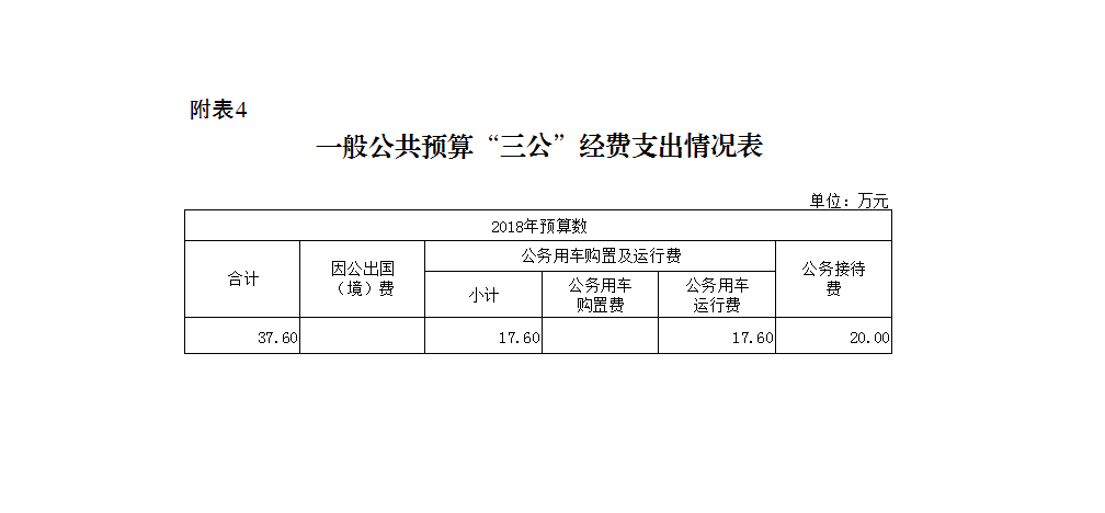 2018年“三公”经费预算37.6万元,与2017年一致。其中:公务接待费20万元,与2017年一致;公务用车运行维护费17.6万元,与2017年一致。