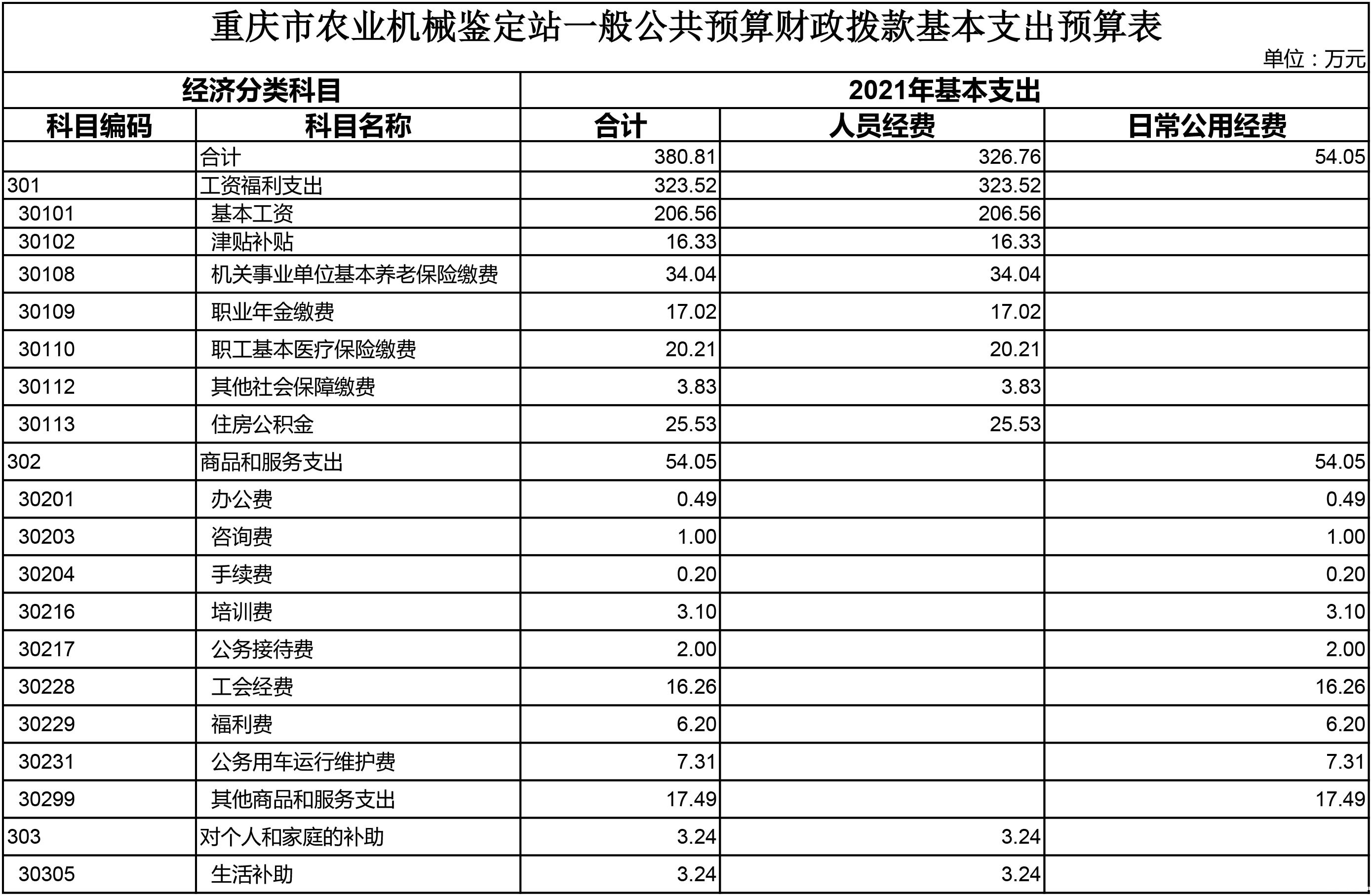 2021年一般公共预算财政拨款收入390.81万元,一般公共预算财政拨款支出390.81万元,比2020年增加19.33万元。其中:基本支出 380.81万元,比2020年增加9.33 万元,主要用于保障在职人员工资福利及社会保险缴费。项目支出10 万元,比2020年增加10万元(2020年无项目预算),主要用于拟举办全市农机化质量监管工作培训,开展农机质量投诉监督、农机质量调查及农机化统计等培训,提升工作人员能力素质,拟开展农业特色产业调研、区县农机化调研指导及企业调研与回访等,促进农业特色产业发展及农机产品提升改造。