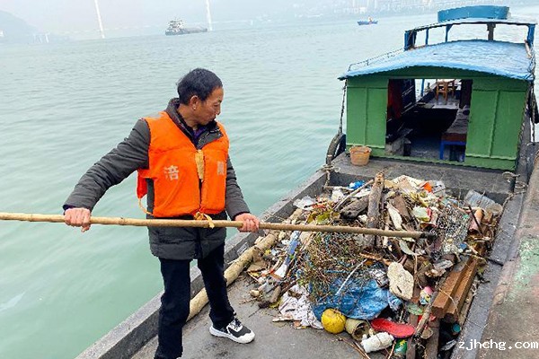 冬日阳光洒在江面上,刘加祥站在清漂船上,将漂过的垃圾麻利地兜上船。