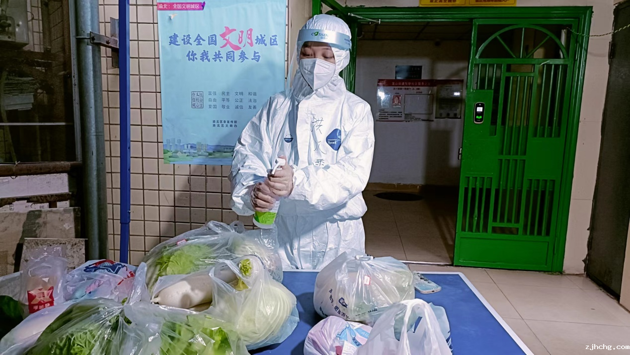 她是“代购员”。市水投集团的陶佳了解到被封控楼栋某独居老人不会网购、生活物资短缺后,第一时间接单,抄起自家的买菜小车,赶赴超市,为老人购买了约10公斤蔬菜、水果,及时补齐所需。