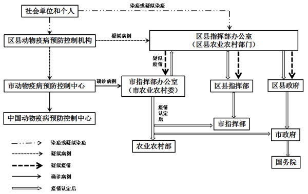 (2)区县指挥部办公室。划定疫点、疫区、受威胁区,组织开展紧急流行病学调查、应急监测和风险分析等工作,并按照规定向区县指挥部、区县政府和市指挥部办公室报告调查、应急处置等情况。