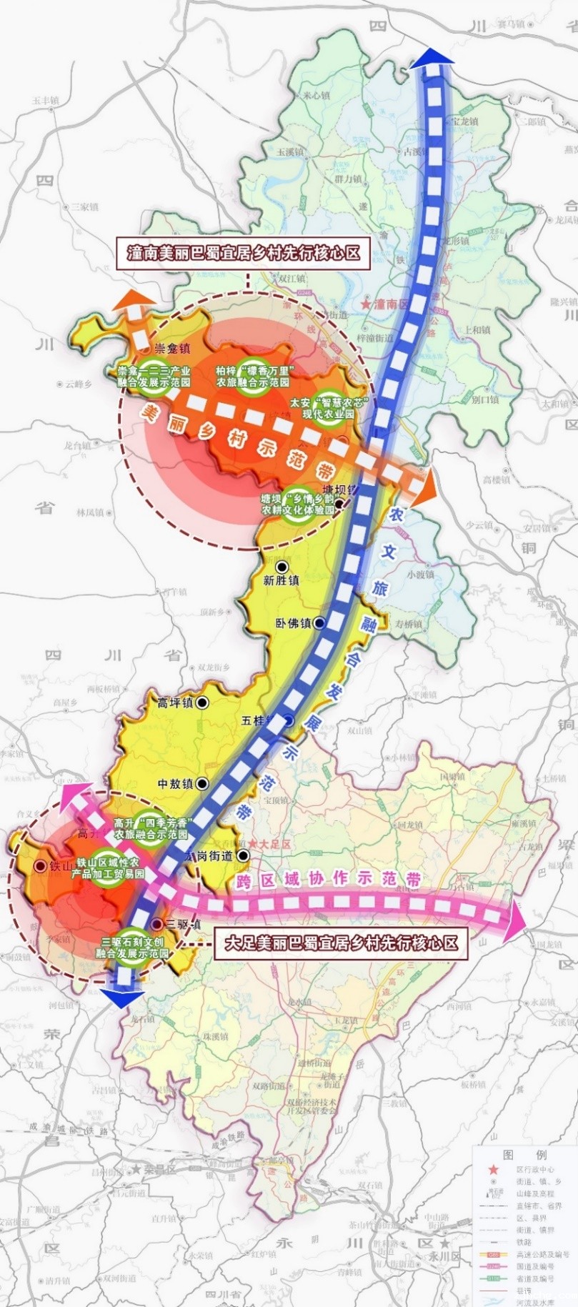 两核:即重庆大足美丽巴蜀宜居乡村示范带先行核心区和重庆潼南美丽巴蜀宜居乡村示范带先行核心区。依托大足区铁山镇、高升镇、三驱镇3个镇和潼南区崇龛镇、柏梓镇、太安镇、塘坝镇4个镇,打造重庆大足先行核心区和重庆潼南先行核心区。