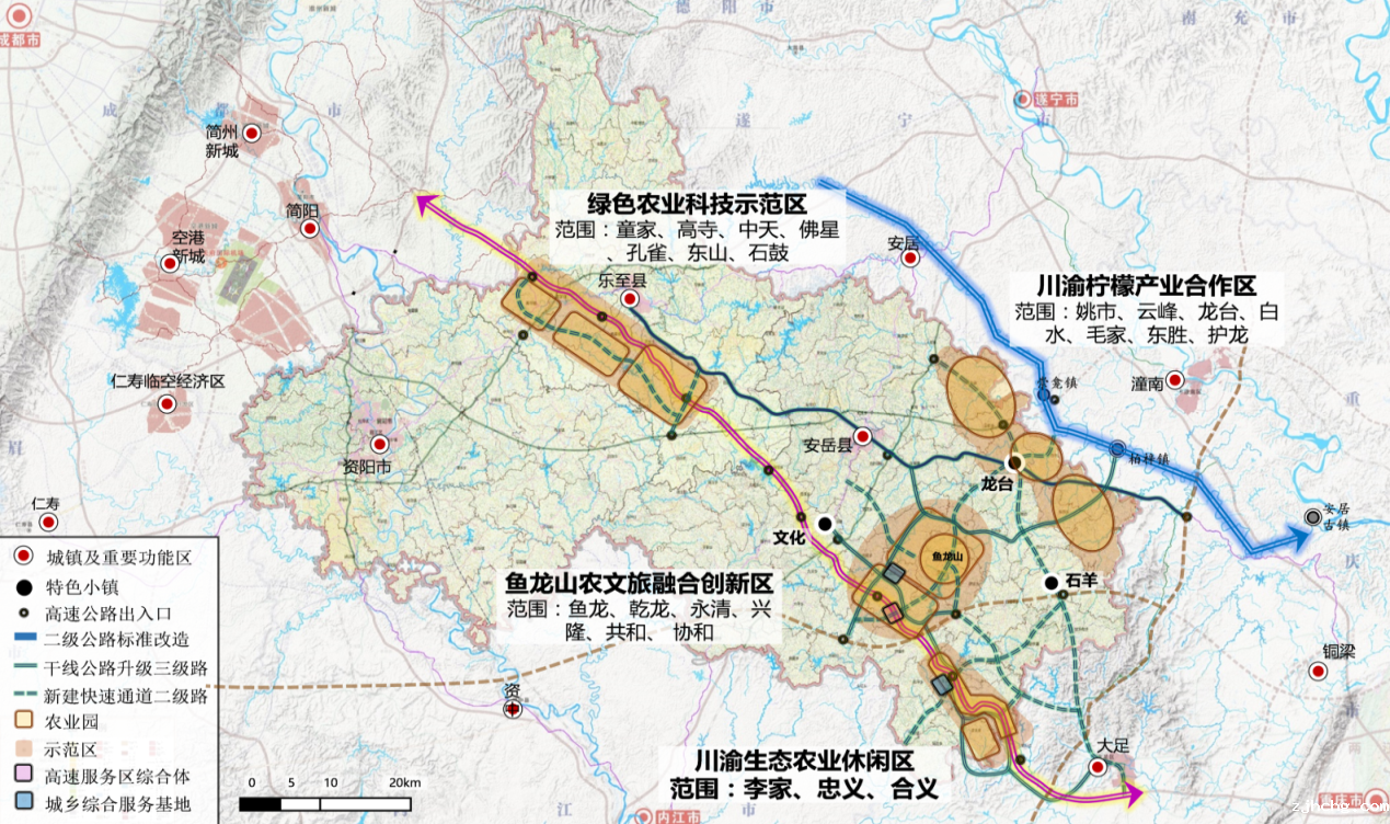 在“一路一河一山”内,规划先行建设“三镇四区十园”,即安岳柠檬文化小镇、石羊石刻文化小镇、龙台柠檬产业小镇3个特色小镇,安岳县川渝柠檬战略合作区、乐至县绿色农业科技示范区、安岳县川渝生态农业展示区、安岳县鱼龙山农文旅创新发展区4个产业集中发展区,以及乐至县的四季果香观光园、十里花香生态园、五彩林乡科技园和安岳县的龙台川渝柠檬科技园、琼江河新品柠檬更新产业园、琼江河精品柠檬绿色产业园、川渝翠竹绿廊产业园、川渝芳香花卉产业园、鱼龙山现代农业产业园、成渝定制农业合作园等10个现代农业园区。