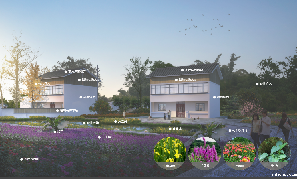 充分利用现有田园景观,开敞路段以乔木+低矮地被组合为主;沿路农房路段结合庭院绿化,以果树和观花小乔木为主;沿路标识牌充分融入柠檬、粮油、太安鱼、芳香等镇村特色,打造收放有致,生活气息浓郁,田园风光优美的乡间景观道。