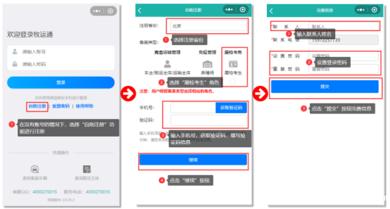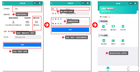 自助注册:应考人员在没有登录账号的情况下可以在“账号密码登录”页面选择“自助注册”功能进行账号的注册,注册成功后可以使用账号和密码进行登录,详细操作如下图所示。