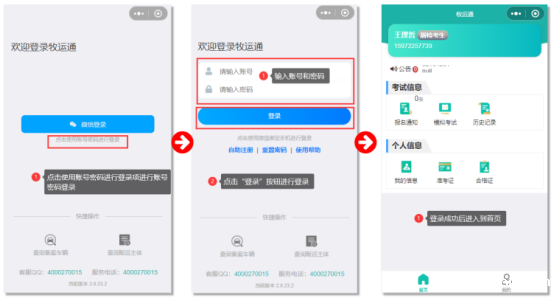 通过手机端“牧运通”微信小程序注册账号、考核报名的具体步骤详见《屠检考务小程序操作说明》(附件2)。电脑端“兽医卫生检验人员考核(屠检考务)”信息平台登录的账号及密码,与考生在“牧运通”微信小程序端注册的账号及密码相同。