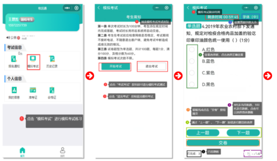 应考人员在首页点击“模拟考核”图标即可进行模拟考核测试,模拟考核次数每天限制2次,每次考核提交后都会生成考核记录,在首页“历史记录”中点击查看,详细操作如下图所示。