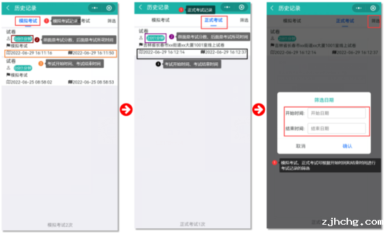 应考人员所有的考核记录(模拟考核和正式考核)可通过首页的“历史记录”功能查看,详细操作如下图所示。