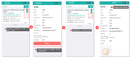 进入到“屠检考务”模块首页后,当有考核报名通知时,在首页左上角的“报名通知”图标会显示报名通知的条数,应考人员点击“报名通知”图标进入到报名通知页面进行报名,选择需要报名的考核通知,在弹出的提示框进行报名,如个人信息未完善,请先去完善个人信息后再进行报名(进行考核报名前请确认已经完善个人信息,若未完善,点击“去完善”按钮或从首页“我的信息”图标进入我的信息页面进行完善,带红色“*”的项为必填项),考试报名时需要下载“兽医卫生检验人员考核报名审核表”,填写审核表上的相关信息后拍照上传进行报名,报名成功后,报名信息为待审核状态(待审核状态的报名应考人员可以进行取消报名,审核通过后无法取消报名),待管理人员审核通过后可以参加正式考核,详细操作如下图所示。