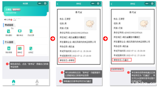 应考人员通过“报名通知”功能成功报名后,在首页点击“准考证”图标可以查看到自己的准考证信息,应考人员在参加考核的时候出示自己的电子准考证信息,也可以将电子准考证保存成图片后打印出来,详细操作如下图所示。