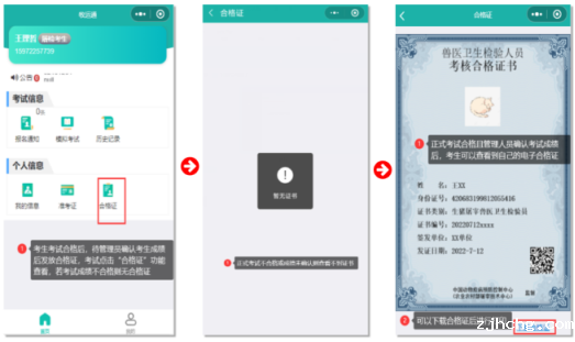 应考人员参加正式考核且考核合格,待管理员确认考核成绩后,发放合格证书,考生在“合格证”功能中可以查看自己的合格证,可以长按下载合格证后打印,若正式考核不合格则没有合格证信息,详细操作如下图所示。